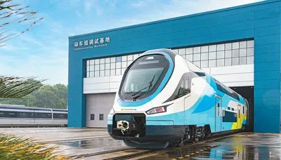 中國首列出口歐洲的雙層動車組在位于湖南省株洲市的中車株機公司下線。