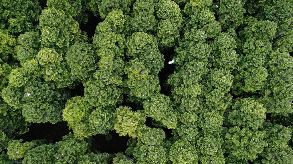 在江蘇省大豐麋鹿國家級(jí)自然保護(hù)區(qū),大量白鷺在樹頂棲息。(無人機(jī)拍攝)新華社記者李響攝