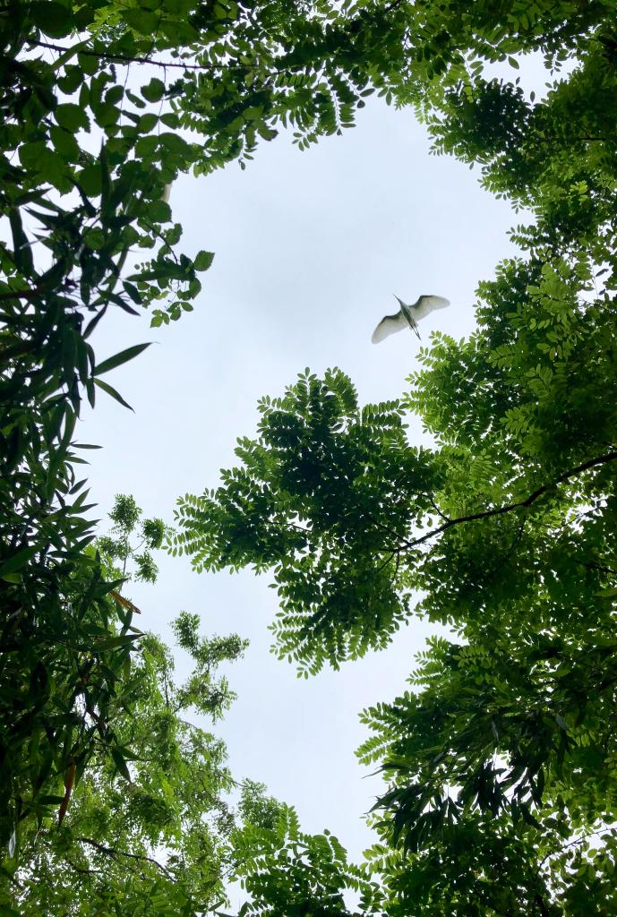 在江蘇省大豐麋鹿國家級(jí)自然保護(hù)區(qū),一只白鷺飛過樹梢。新華社記者李響攝