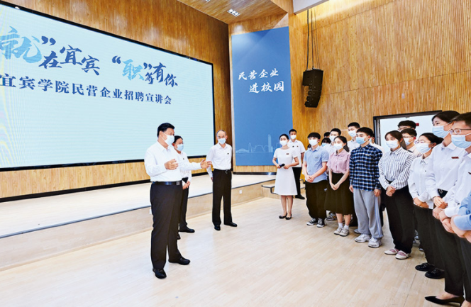 2022年6月8日,中共中央總書(shū)記、國(guó)家主席、中央軍委主席習(xí)近平在四川考察。這是8日下午,習(xí)近平在宜賓學(xué)院考察時(shí),向正在參加企業(yè)招聘宣講會(huì)的教師、學(xué)生、企業(yè)負(fù)責(zé)人了解企業(yè)招工需求和畢業(yè)生簽約率等情況。 新華社記者 李學(xué)仁/攝