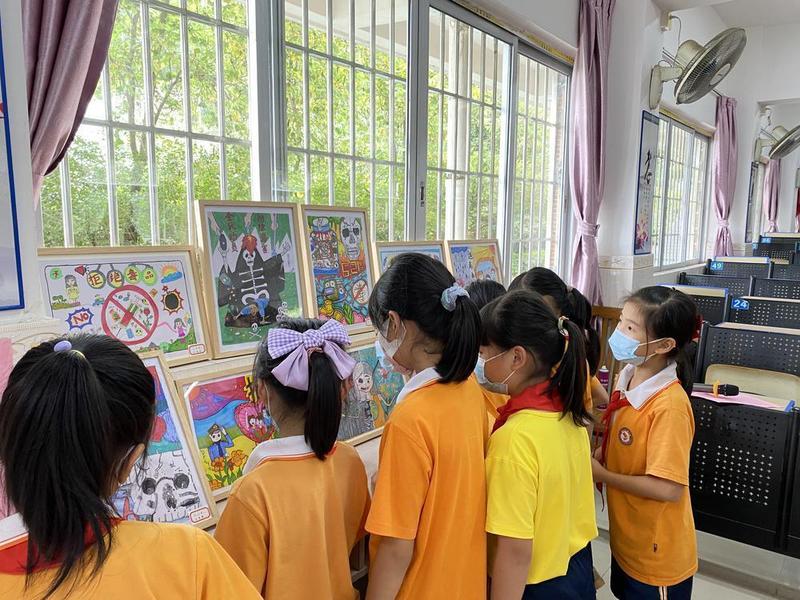 學(xué)生們觀看禁毒親子繪畫比賽作品