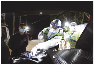 4月9日,執(zhí)勤民警在燈根檢查點(diǎn)檢查過(guò)往車輛。