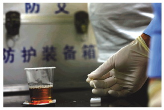 4月20日,民警對(duì)犯罪嫌疑人尿液進(jìn)行毒檢。