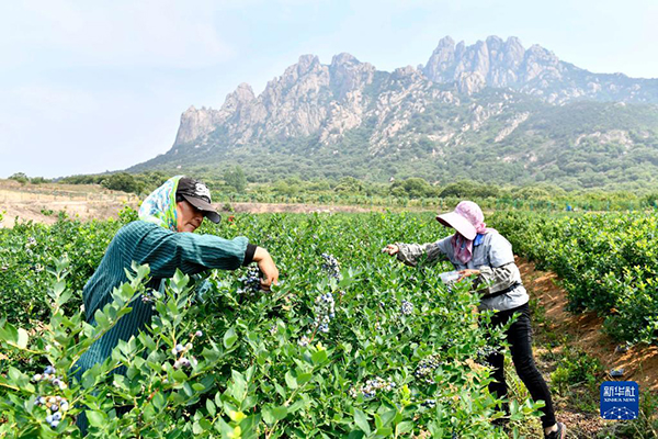 村民在山東省五蓮縣九五農(nóng)業(yè)現(xiàn)代林果科技產(chǎn)業(yè)園采摘藍(lán)莓(2022年6月18日攝)。新華社記者 郭緒雷 攝