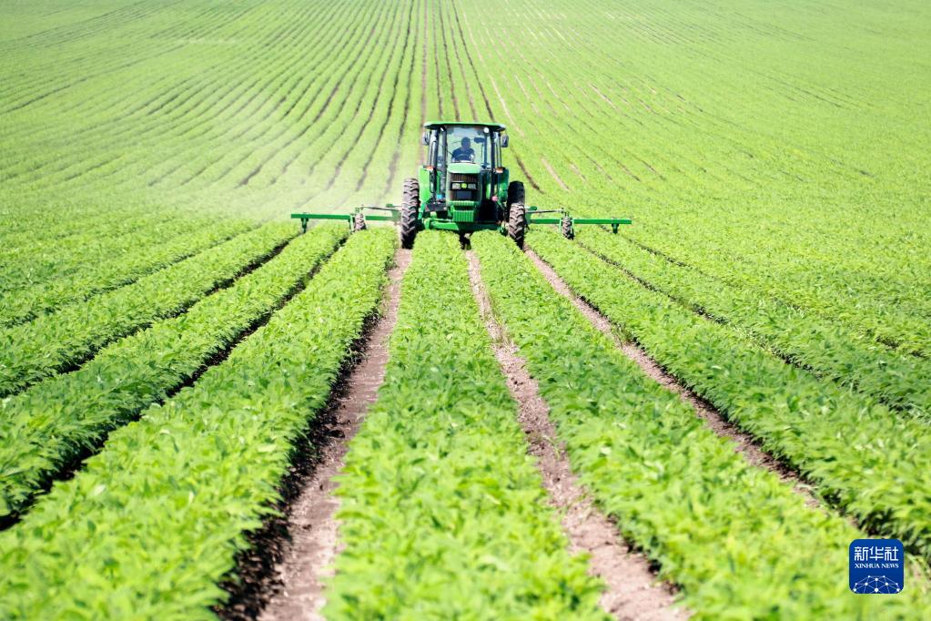 黑龍江北大荒農(nóng)墾集團(tuán)五大連池農(nóng)場(chǎng)有限公司工作人員進(jìn)行大豆中耕除草作業(yè)(2022年6月29日攝)。新華社發(fā)(陸文祥 攝)