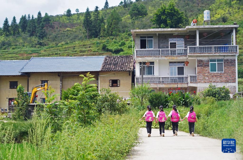 在江西省贛州市崇義縣上堡鄉(xiāng)上堡村,孩子們走在放學(xué)回家的路上(2020年9月10日攝)。遠(yuǎn)處是一戶村民的土坯房祖屋和新建的三層小樓。新華社記者 萬象 攝