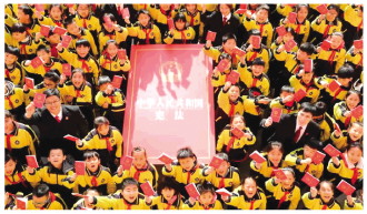 2014年11月,全國人大常委會作出決定將12月4日設(shè)立為國家憲法日。圖為2020年12月3日,山東省棗莊市市中區(qū)人民法院的法官與學(xué)生們一起迎接第7個“國家憲法日”的到來。 本報(bào)通訊員 吉喆 攝