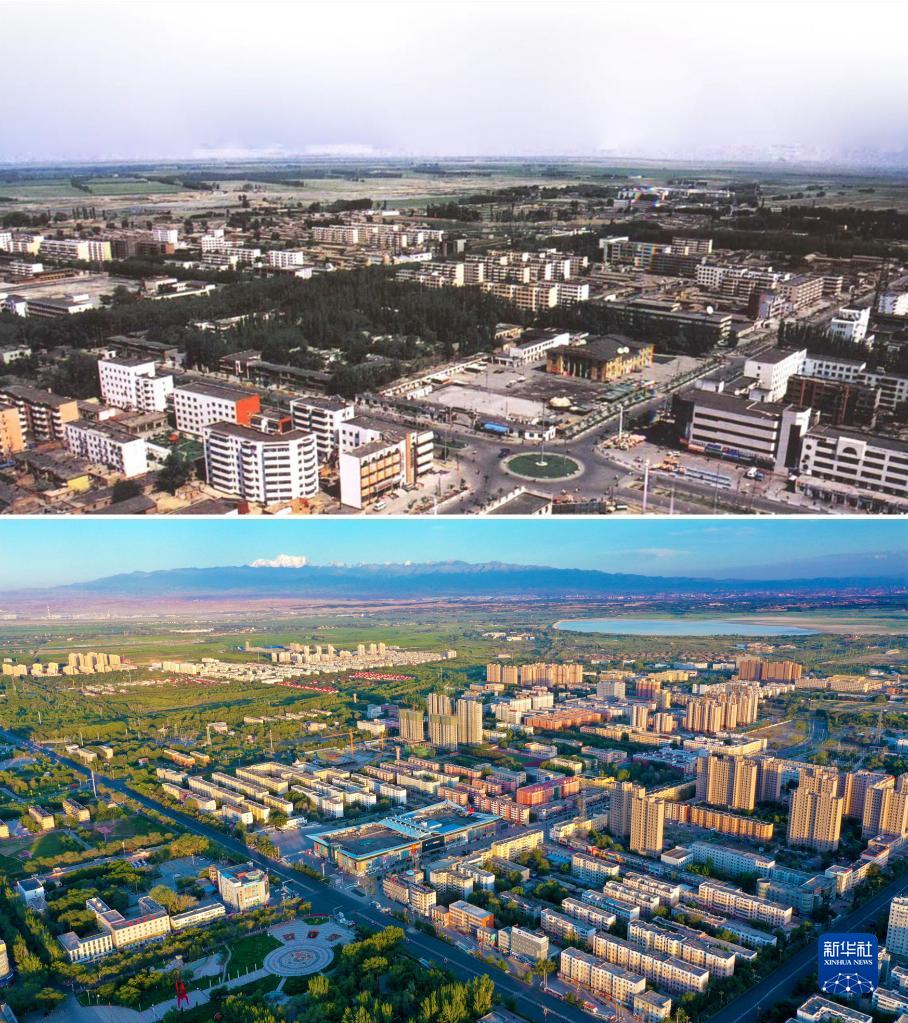 拼版照片:上圖為2000年拍攝的新疆生產(chǎn)建設(shè)兵團(tuán)農(nóng)六師五家渠市(資料照片);下圖為2020年7月26日無(wú)人機(jī)拍攝的新疆生產(chǎn)建設(shè)兵團(tuán)第六師五家渠市(李華北攝)。新華社發(fā)